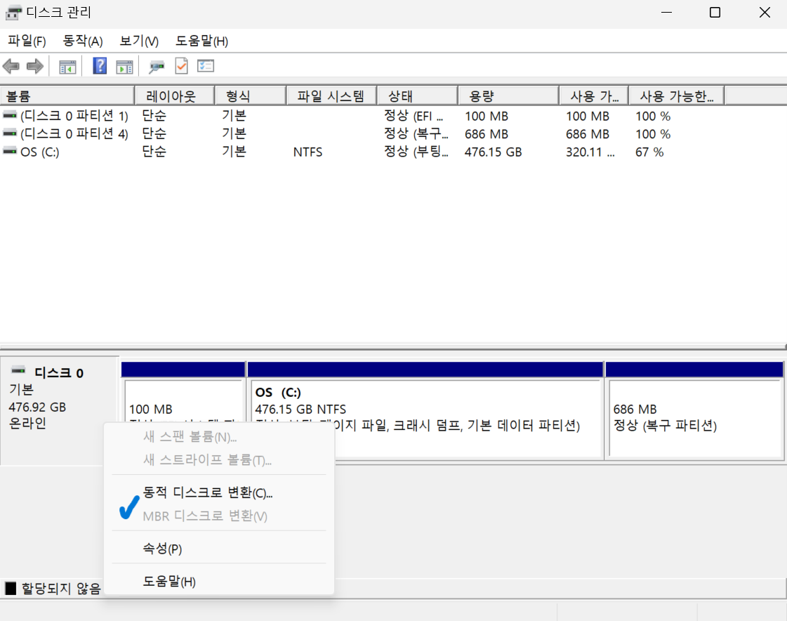 * 위 사진에는 현재 내 컴퓨터가 GPT형식이라 [MBR 디스크로 변환]이 뜨며 비활성화되어 있다.
