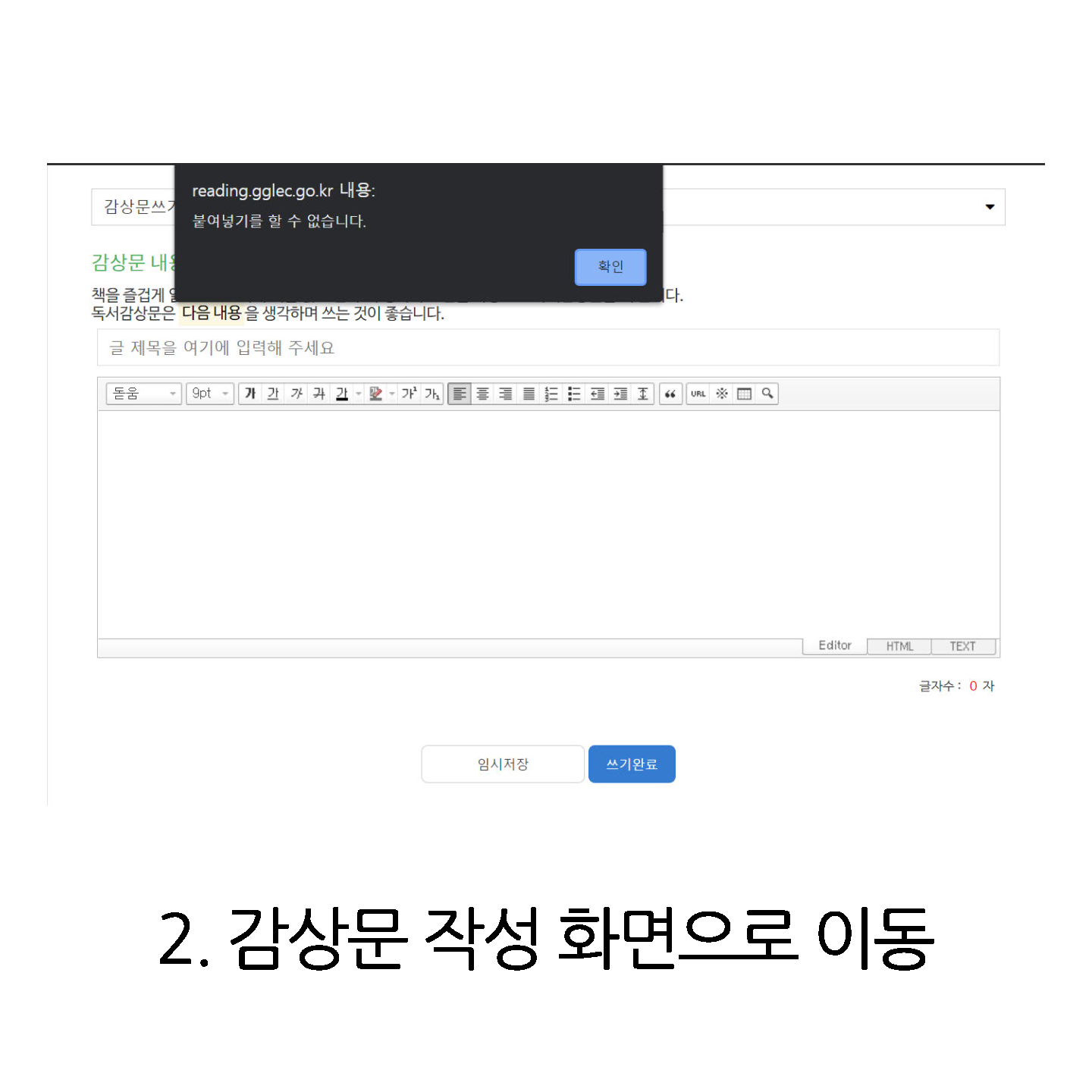 독서종합시스템 접속 → JavaScript해제 → 글 복사 붙여넣기 → JavaScript 다시 활성화 → <등록>버튼 누르기
