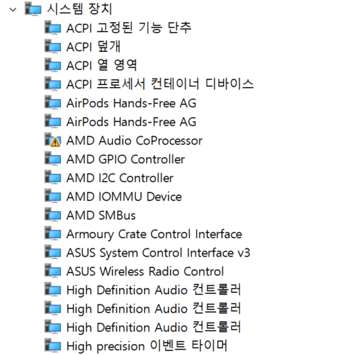 위 사진과 같이 오디오 장치 중 AMD Audio CoProcessor가 오류인 상태였다.