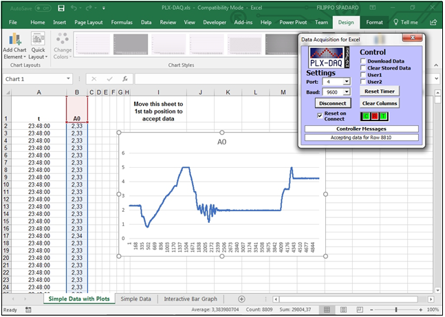 Parallax Data Acquisition tool (PLX-DAQ) software add-in for Microsoft Excel acquires up to 26 channels of data from any Parallax microcontrollers and drops