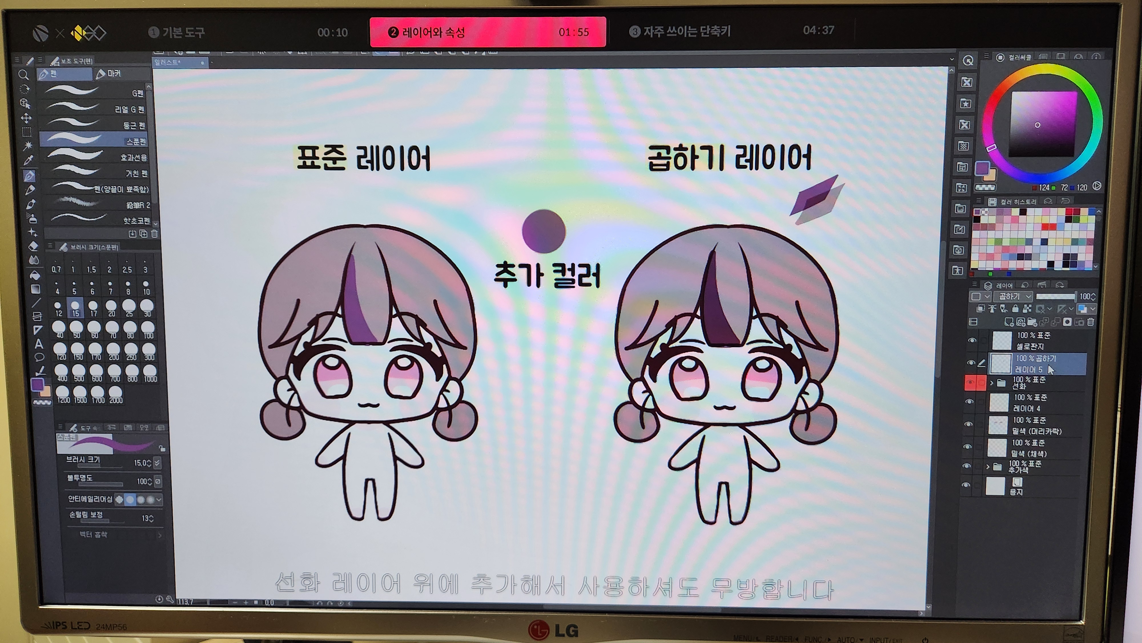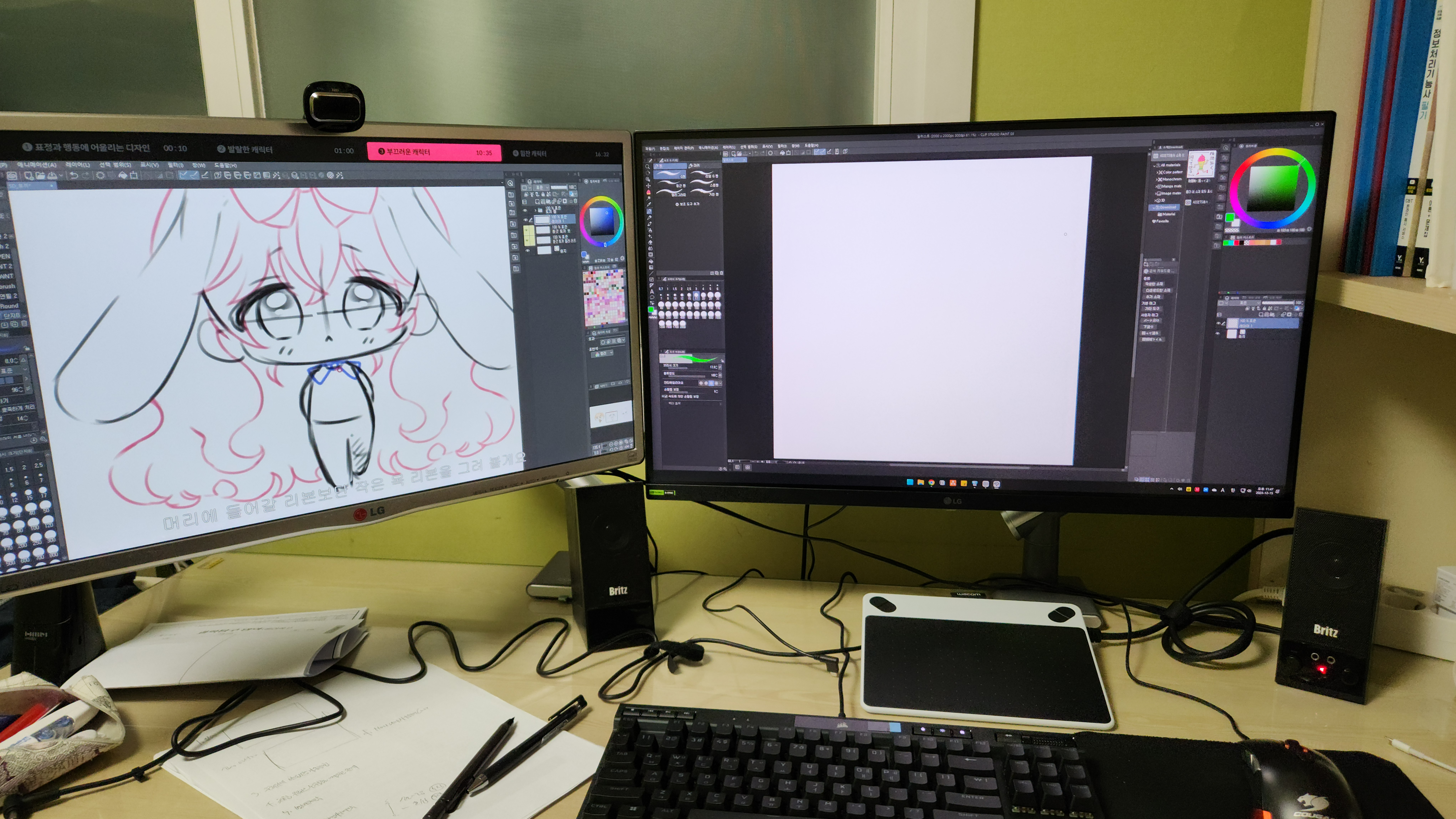 강의를 듣는 모습입니다. 모니터 두 개를 이용해 하나는 강의를 듣고 하나는 동시에 실습을 하고 있습니다. 일러스트를 그리는 과정이 포함되어있으니 그림연습까지 하시고 싶은 분은 판타블렛 하나 구입하시는 것을 추천드립니다. 사진에 나온 사이즈 정도면 20만원에 괜찮은 것 구하실 수 있습니다. 추천드리는 브랜드는 Wacom입니다.