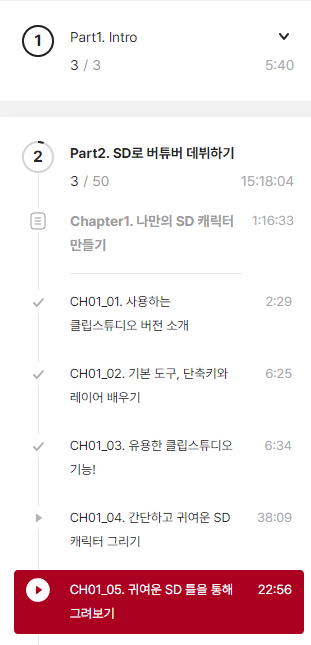 가끔 긴 강의를 들으면 "그래서 지금 내가 학습과정의 어디쯤에 와있지?"라는 생각이 들 때가 많습니다. 뭐.. 보통 강사의 역량부족이겠지만 안타깝게도 대부분 강의의 강사 역량이 부족합니다. 하지만 클립 형식으로 되어있으면 클립 제목을 통해 강사 역량에 상관없이 커리큘럼을 직관적으로 이해할 수 있고, 내가 지금 어느 위치에 있는지를 느껴가면서 배울 수 있습니다. 커리큘럼을 설명하는 또다른 강의를 듣거나, 스스로 강의 내용을 범주화시키고 체계화시키는 과정이 생략될 수 있다는 것도 장점이겠네요. 공부를 해 보신 분이라면 자기가 지금 어느 부분의 무엇을 왜 배우는지를 인지하는게 얼마나 중요한지 잘 아실 것이라고 생각합니다.