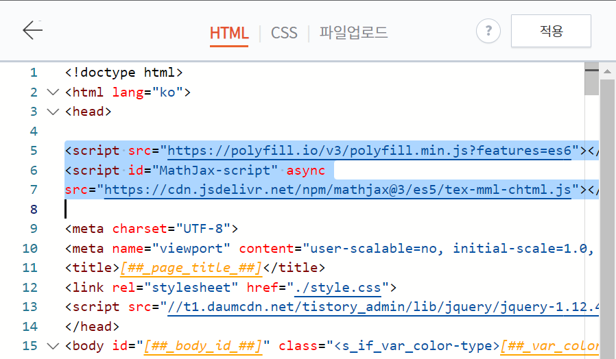 솔직히 수식을 자주 입력하게 되는 사람이라면 스킨 자체를 편집해 모든 글에 일괄 적용해놓는 것이 편리하다. 매번 html을 건드릴 필요 없이 수식을 입력할 수 있다.