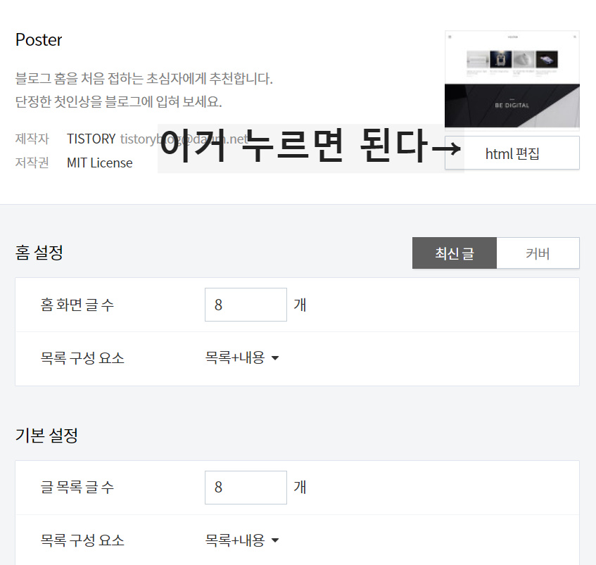 1. 설정 아이콘 > 블로그 관리 > 스킨 편집 > (이미지 밑에) Html편집