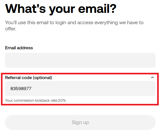 아래 사진과 같이 레퍼럴 코드가 입력되고, "Your commission kickback rate: 20%"라는 문구가 뜨면 정상적으로 수수료 할인이 적용되는 중이다.