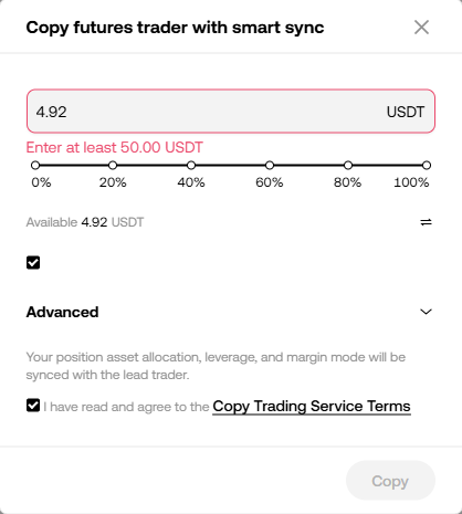 ⚠️ 카피트레이딩 최소 등록 금액은 $50입니다. 그보다 작은 금액을 등록하려고 시도하면 아래와 같이 "Enter at least 50.00 USDT"라는 메세지가 나옵니다.
